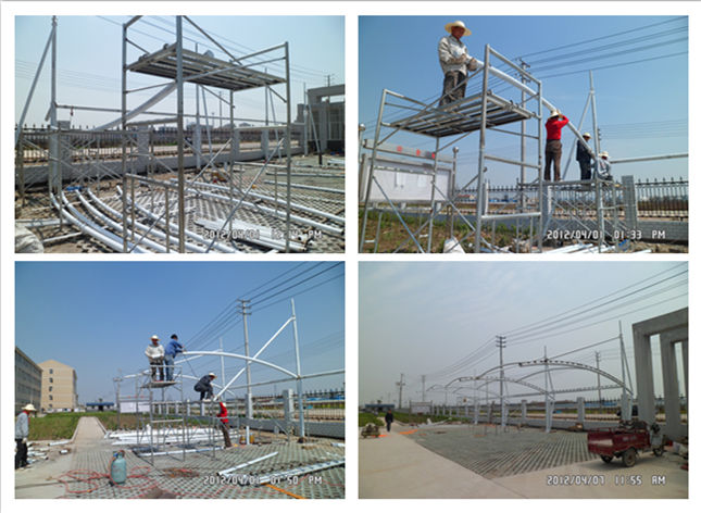 圖2 美味源公司吊塔式圓管膜結(jié)構(gòu)汽車車棚現(xiàn)場(chǎng)施工圖