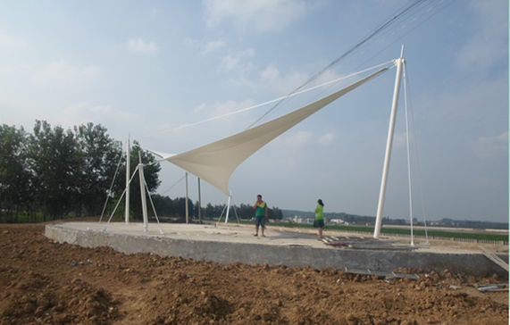 老河口市軍用機(jī)場(chǎng)觀景臺(tái)張拉膜結(jié)構(gòu),其結(jié)構(gòu)以鋼柱為受力支撐點(diǎn),全軟邊鋼索預(yù)應(yīng)力張拉成型,各環(huán)節(jié)制作安裝精度要求極高,整體結(jié)構(gòu)輕盈而優(yōu)美,既有鋼柱、鋼索牽引的力量之美,又有pvdf建筑膜材的柔性曲線之美,大氣、時(shí)尚、牢固實(shí)用,剛與柔完美融合,堪稱典型景觀膜結(jié)構(gòu)造型。
