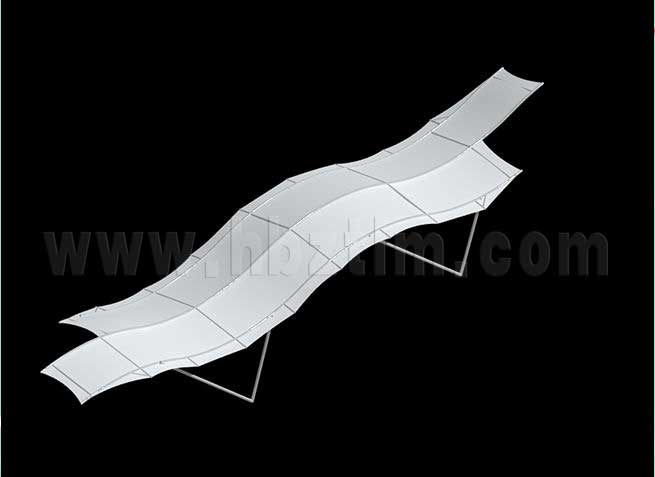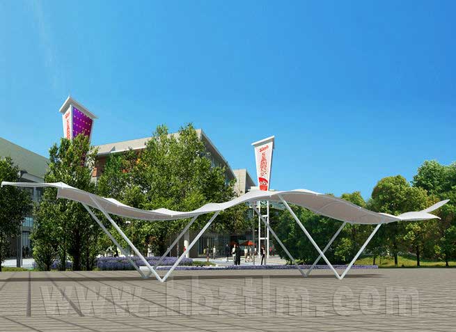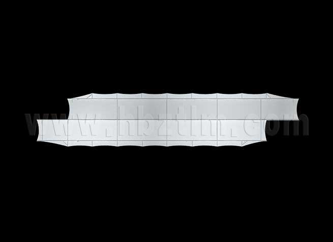 膜材采用PVDF國產或者進口建筑膜材、PTFE玻璃纖維建筑膜材、ETFE透明的永久性建筑膜材;自動放樣裁剪,高頻焊接,拉伸效果超強,曲線成型可千變萬化;膜材質保一般可達15-20年。