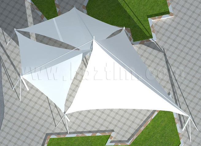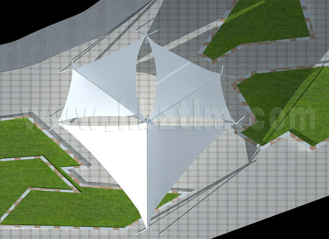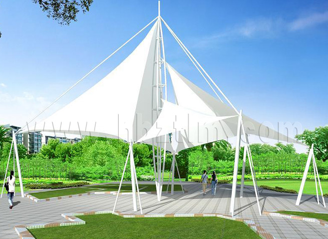 膜材采用PVDF國產或者進口建筑膜材、PTFE玻璃纖維建筑膜材、ETFE透明的永久性建筑膜材;自動放樣裁剪,高頻焊接,拉伸效果超強,曲線成型可千變萬化;膜材質保一般可達15-20年。