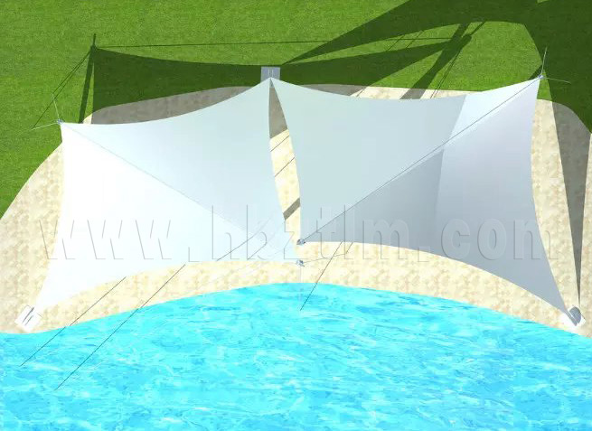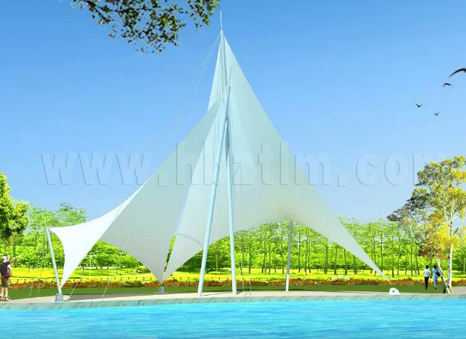膜材采用PVDF國產或者進口建筑膜材、PTFE玻璃纖維建筑膜材、ETFE透明的永久性建筑膜材;自動放樣裁剪,高頻焊接,拉伸效果超強,曲線成型可千變萬化;膜材質保一般可達15-20年。