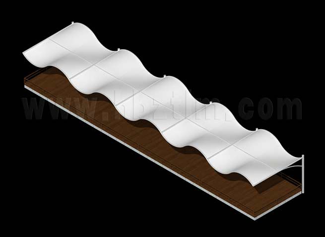 膜材采用PVDF國產(chǎn)或者進口建筑膜材、PTFE玻璃纖維建筑膜材、ETFE透明的永久性建筑膜材;自動放樣裁剪,高頻焊接,拉伸效果超強,曲線成型可千變萬化;膜材質保一般可達15-20年。