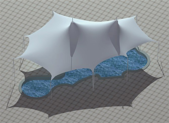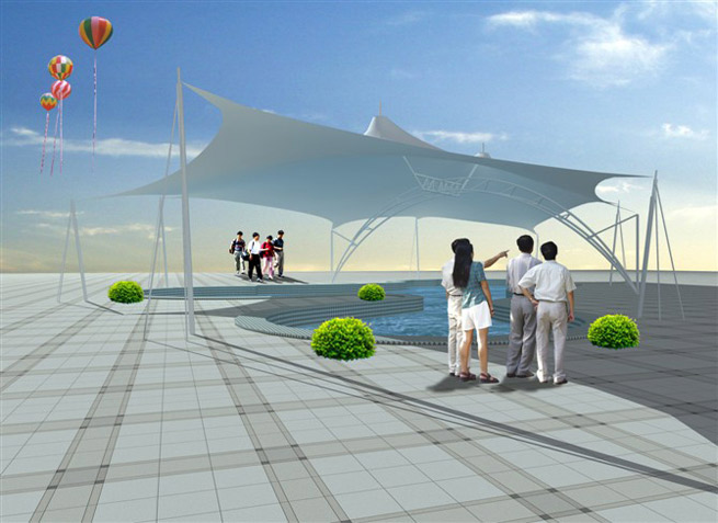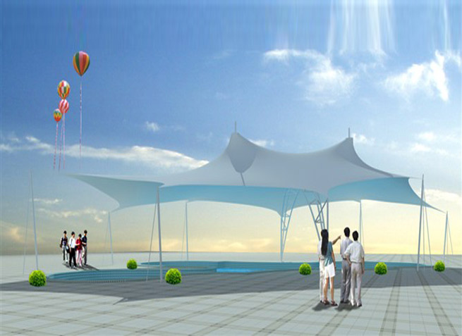 膜材采用PVDF國產或者進口建筑膜材、PTFE玻璃纖維建筑膜材、ETFE透明的永久性建筑膜材;自動放樣裁剪,高頻焊接,拉伸效果超強,曲線成型可千變萬化;膜材質保一般可達15-20年。