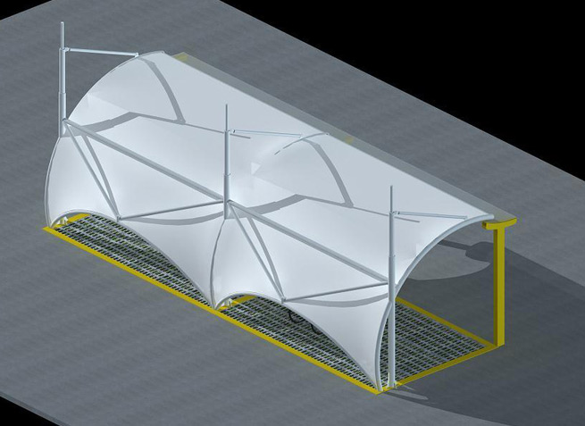膜材采用PVDF國產(chǎn)或者進口建筑膜材、PTFE玻璃纖維建筑膜材、ETFE透明的永久性建筑膜材;自動放樣裁剪,高頻焊接,拉伸效果超強,曲線成型可千變?nèi)f化;膜材質(zhì)保一般可達15-20年。