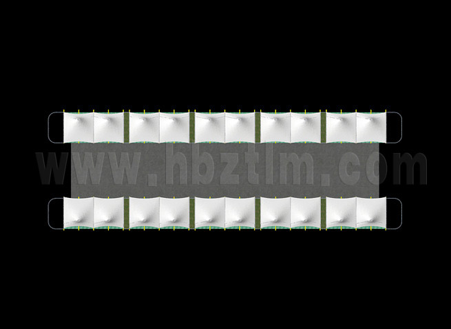 膜材采用PVDF國產或者進口建筑膜材、PTFE玻璃纖維建筑膜材、ETFE透明的永久性建筑膜材;自動放樣裁剪,高頻焊接,拉伸效果超強,曲線成型可千變萬化;膜材質保一般可達15-20年。