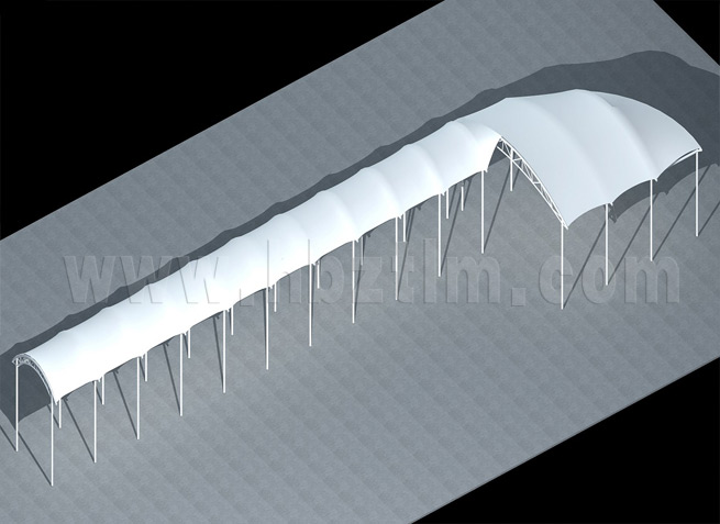 膜材采用PVDF國產(chǎn)或者進口建筑膜材、PTFE玻璃纖維建筑膜材、ETFE透明的永久性建筑膜材;自動放樣裁剪,高頻焊接,拉伸效果超強,曲線成型可千變?nèi)f化;膜材質(zhì)保一般可達15-20年。