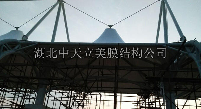 圖1 咸寧學(xué)??磁_(tái)膜結(jié)構(gòu)拉?,F(xiàn)場(chǎng)施工圖