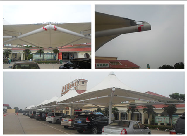 G4高速湖北孝感景觀停車棚膜結(jié)構,該項目為景觀性停車棚膜結(jié)構,采用連帽頂全軟邊張拉形式,美觀而實用,冒頂還做了特殊精工裝飾處理,整個結(jié)構高度達到了6米,單車位投影也達到3米×6米,實為大氣。該項目采用PVDF白色車棚專用建筑膜材,整體結(jié)構從設計到施工,都精工細作,臻至完美。