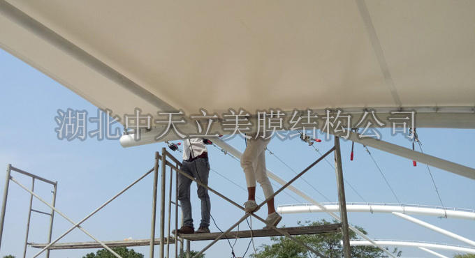 圖2 九宮山T型圓管膜結(jié)構(gòu)車棚拉膜現(xiàn)場施工圖