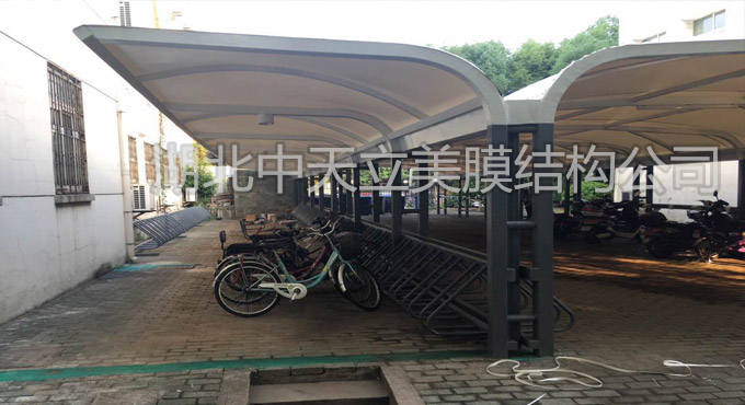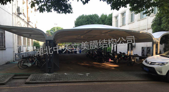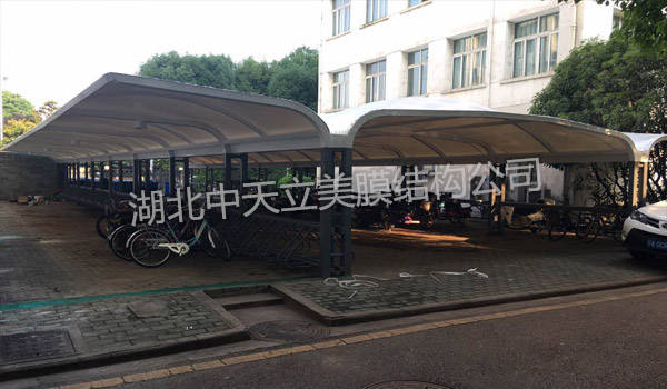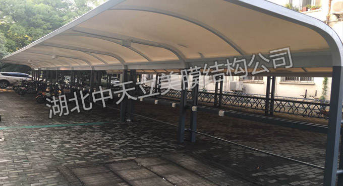 武漢市市政府膜結構自行車停車棚項目,這次市政府膜結構自行車停車棚甲方要求很高,膜材采用的是德國海德斯進口膜材進口膜材,膜材自潔性高,張拉力強,膜材質保15年,使用壽命長。本項目采用前軟邊后硬邊張拉形式整體結構美觀實用,經濟牢固,臻至完美。