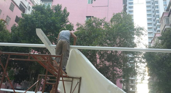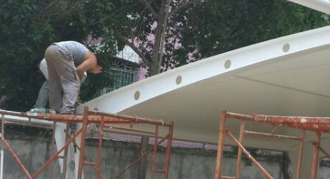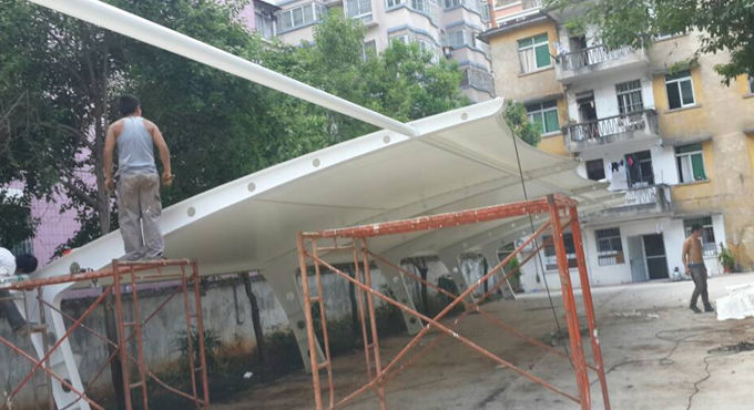 圖1 韶關(guān)市氣象局膜結(jié)構(gòu)車棚現(xiàn)場施工圖