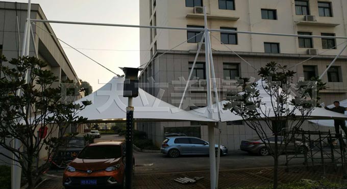 已拉好部分膜結(jié)構(gòu)車棚細節(jié)展示,車棚側(cè)面及背面細圖片展示可以更直觀的了解帽頂式車棚樣式。