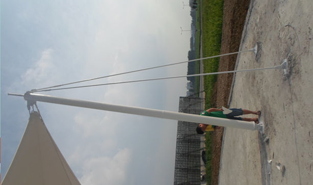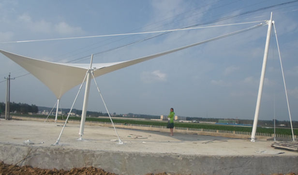 老河口市軍用機(jī)場(chǎng)觀景臺(tái)張拉膜結(jié)構(gòu),其結(jié)構(gòu)以鋼柱為受力支撐點(diǎn),全軟邊鋼索預(yù)應(yīng)力張拉成型,各環(huán)節(jié)制作安裝精度要求極高,整體結(jié)構(gòu)輕盈而優(yōu)美,既有鋼柱、鋼索牽引的力量之美,又有pvdf建筑膜材的柔性曲線之美,大氣、時(shí)尚、牢固實(shí)用,剛與柔完美融合,堪稱典型景觀膜結(jié)構(gòu)造型。