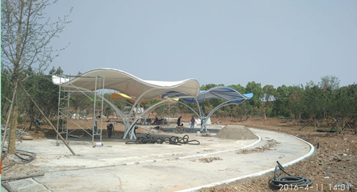 荊門市千佛洞植物園一期二標(biāo)園林景觀膜結(jié)構(gòu)工程?,該項(xiàng)目結(jié)構(gòu)以荷葉的外形為基本參照設(shè)計(jì),全弧管結(jié)構(gòu)拼裝,做工精細(xì),整體流線型的外形和建筑膜材全硬邊式張拉給人以剛?cè)嶂?,為了豐富其視角效果,我們采用了彩色建筑膜以示渲染,作為公園的休閑景觀,既給人以納涼之處,又給整體環(huán)境以時尚現(xiàn)代之美。此類結(jié)構(gòu)被廣泛應(yīng)...
