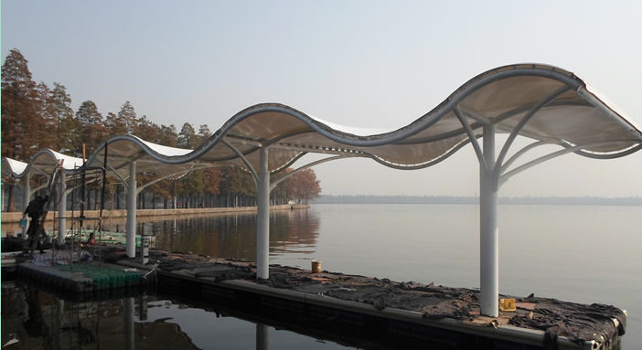 武漢東湖執(zhí)法艇碼頭景觀膜結(jié)構(gòu)?,該項(xiàng)目結(jié)構(gòu)為S型景觀功能性膜結(jié)構(gòu),也為波浪型結(jié)構(gòu),其立柱可放中間或者是兩側(cè),根據(jù)功能的需要,多為弧管連接,展現(xiàn)其優(yōu)美的線條感,通常在出入口、通道連廊、車站碼頭或者公園、廣場等地方運(yùn)用的極為廣泛。