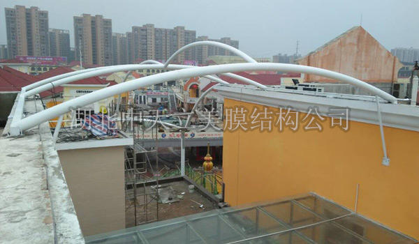武漢盤龍城奧特萊斯屋頂頂棚現(xiàn)場拉膜施工圖