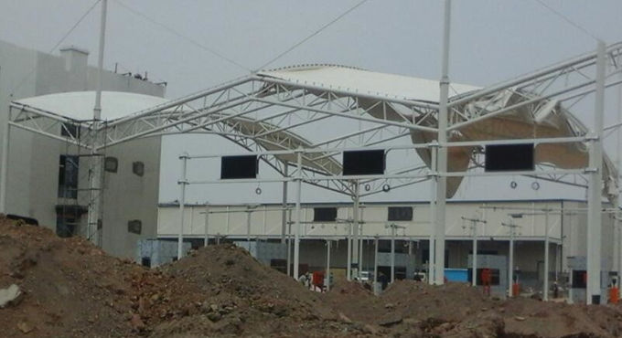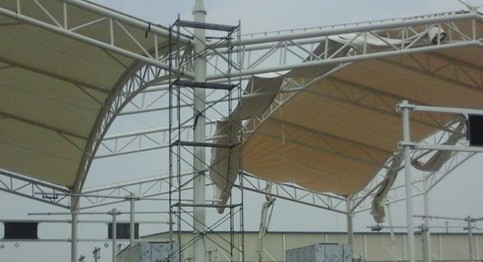 圖1 湖南衡陽工業(yè)園大門門頭膜結(jié)構(gòu)鋼結(jié)構(gòu)現(xiàn)場施工圖
