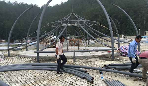 十堰櫻桃小鎮(zhèn)親子游樂園膜結(jié)構(gòu)選擇與湖北中天立美公司合作游樂園頂棚膜結(jié)構(gòu)項目!本次合作游樂園頂棚膜結(jié)構(gòu)項目合作面積達(dá)1250平方,一共要做六個造型各異的膜結(jié)構(gòu)頂棚。下面中天立美小編就去十堰親子游樂園現(xiàn)場去看看工程進(jìn)度,為工程人員施工現(xiàn)場情況做個簡單的現(xiàn)場介紹。